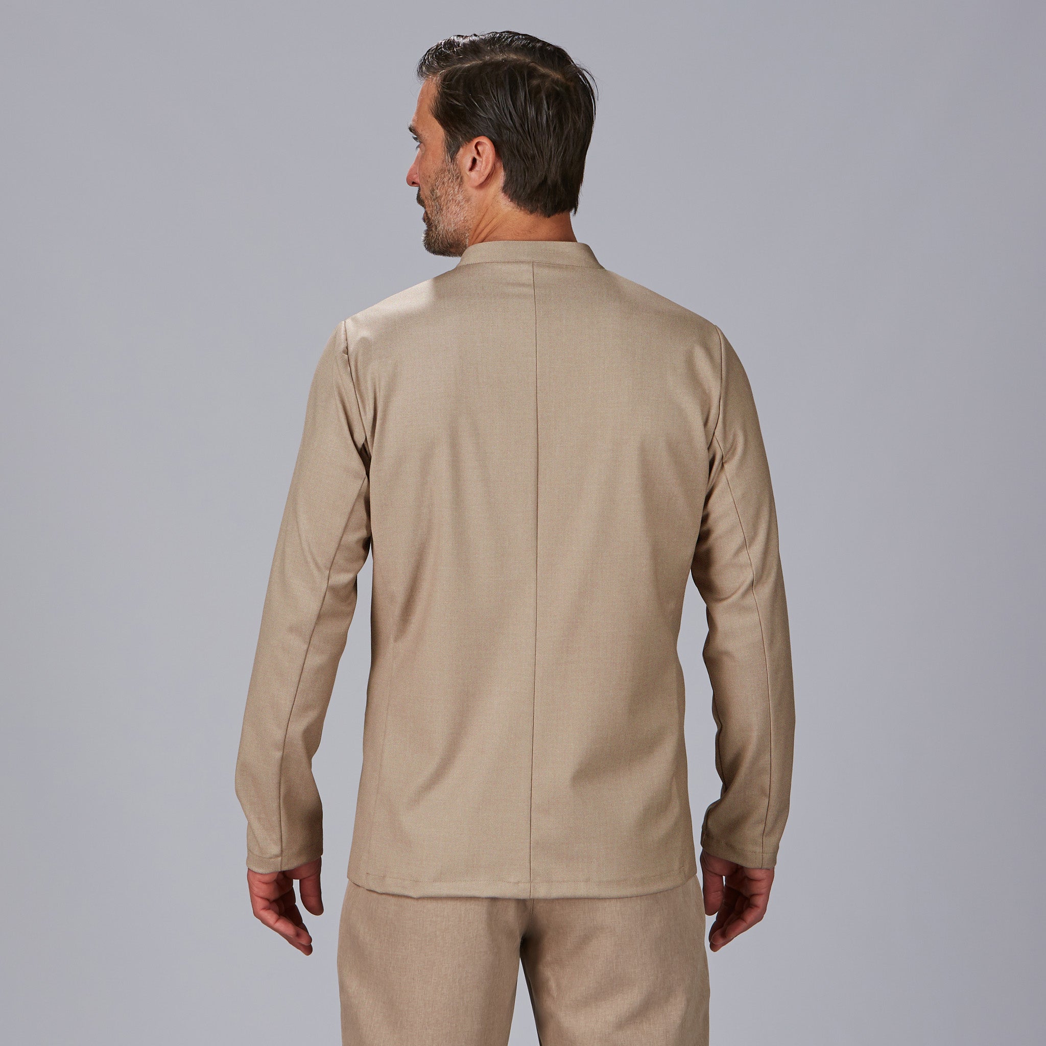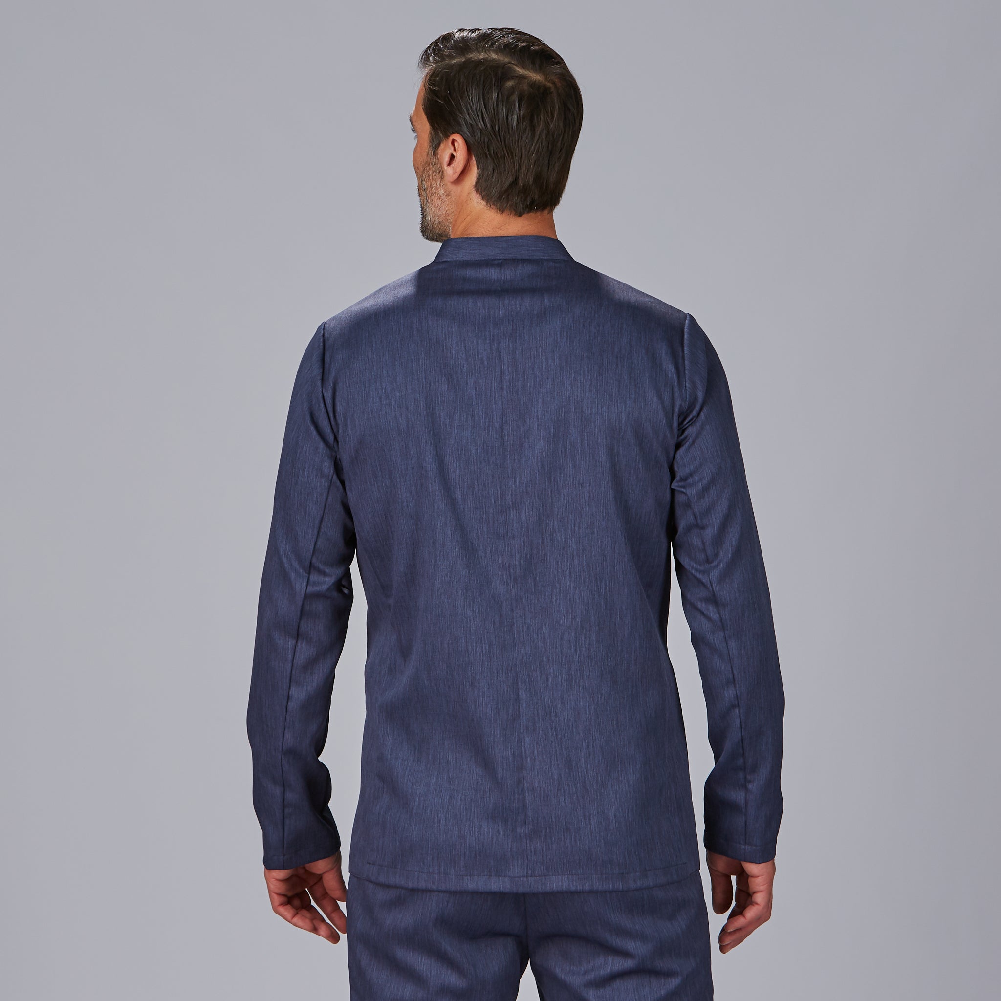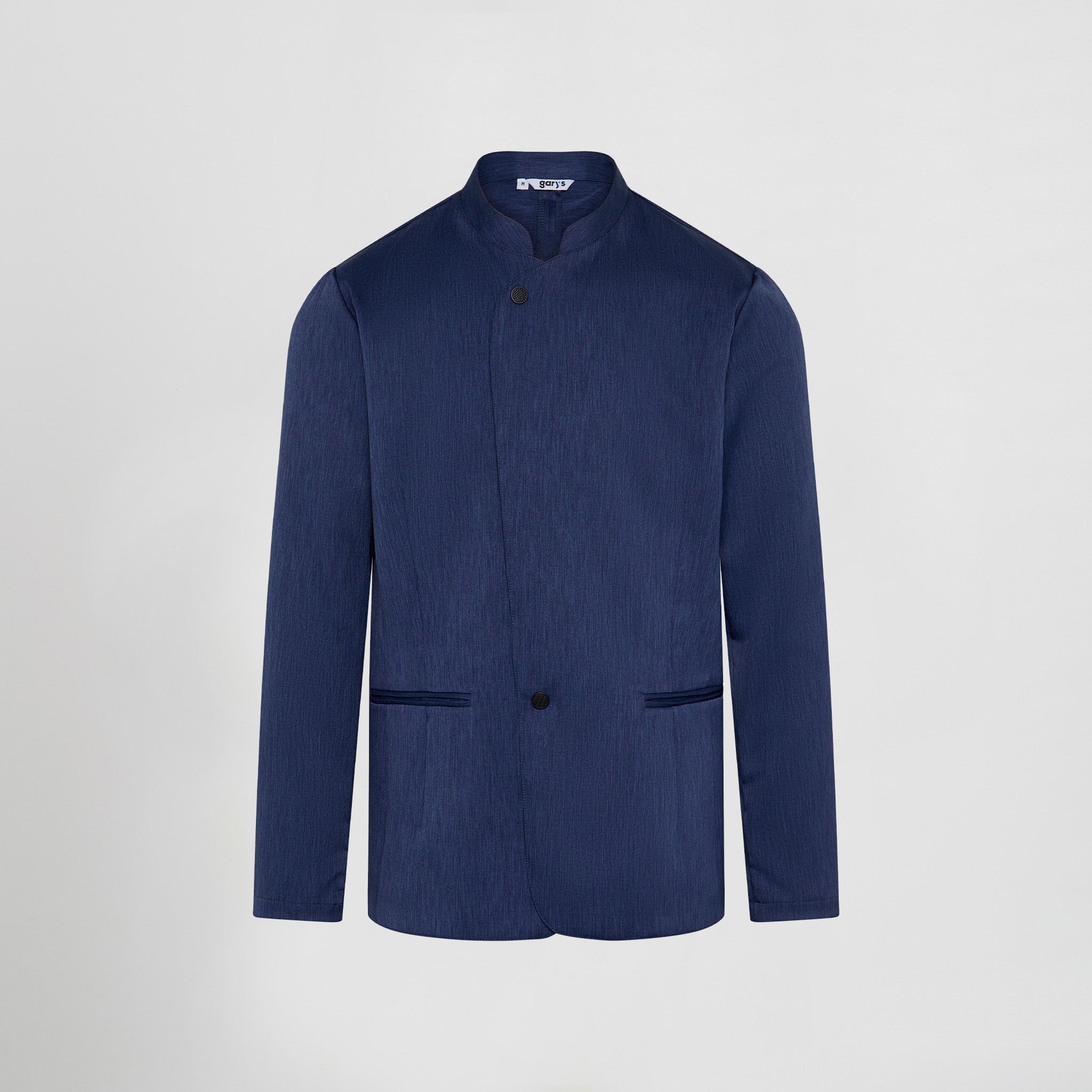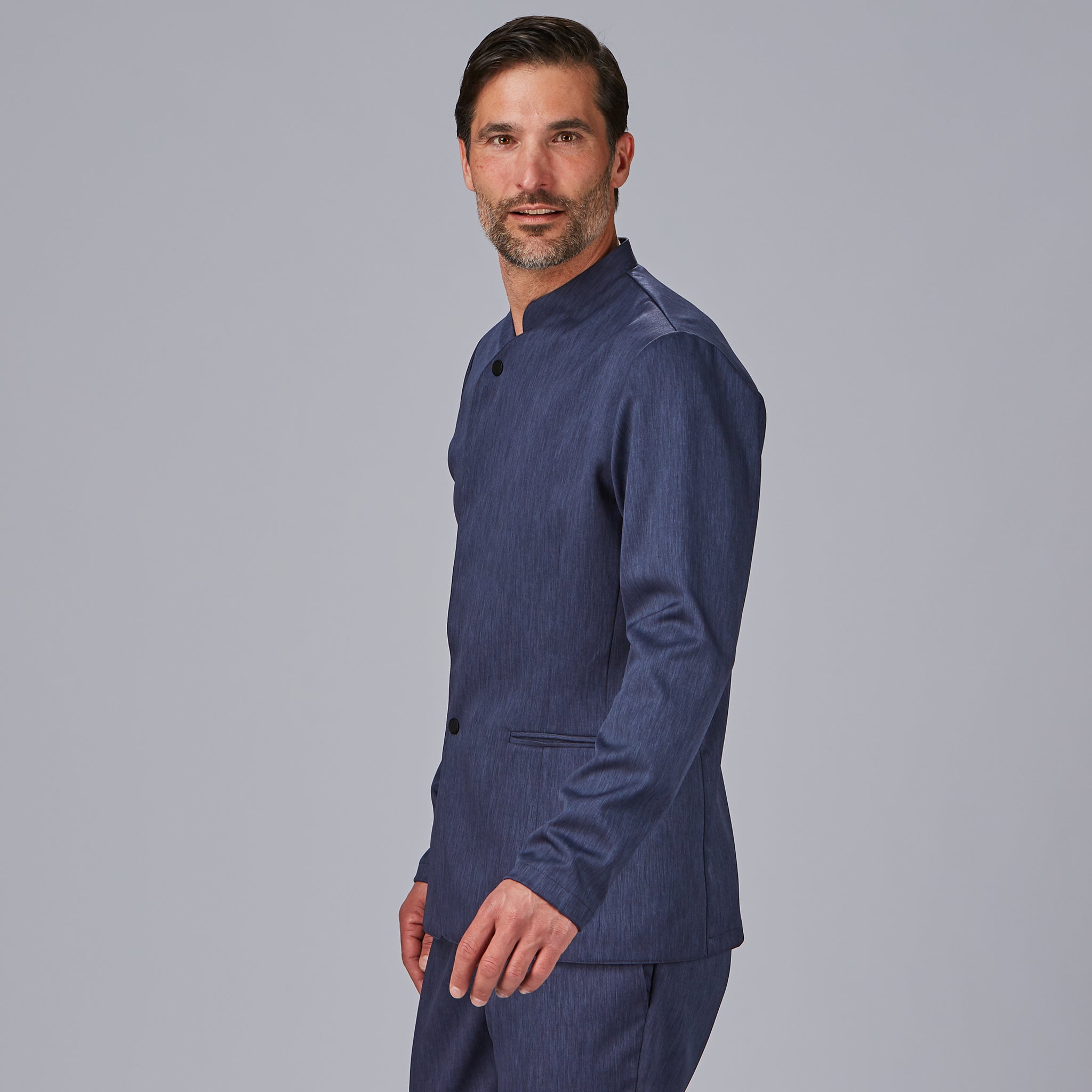 Confeccionada en tejido bioelástico jaspeado (96% poliéster, 4% elastano, 185 g/m²), esta chaqueta ofrece una excelente libertad de movimiento, resistencia al uso diario y una caída fluida que favorece la silueta masculina. Disponible en dos colores sobrios y versátiles: marino y arena, que combinan con facilidad en cualquier uniforme profesional.