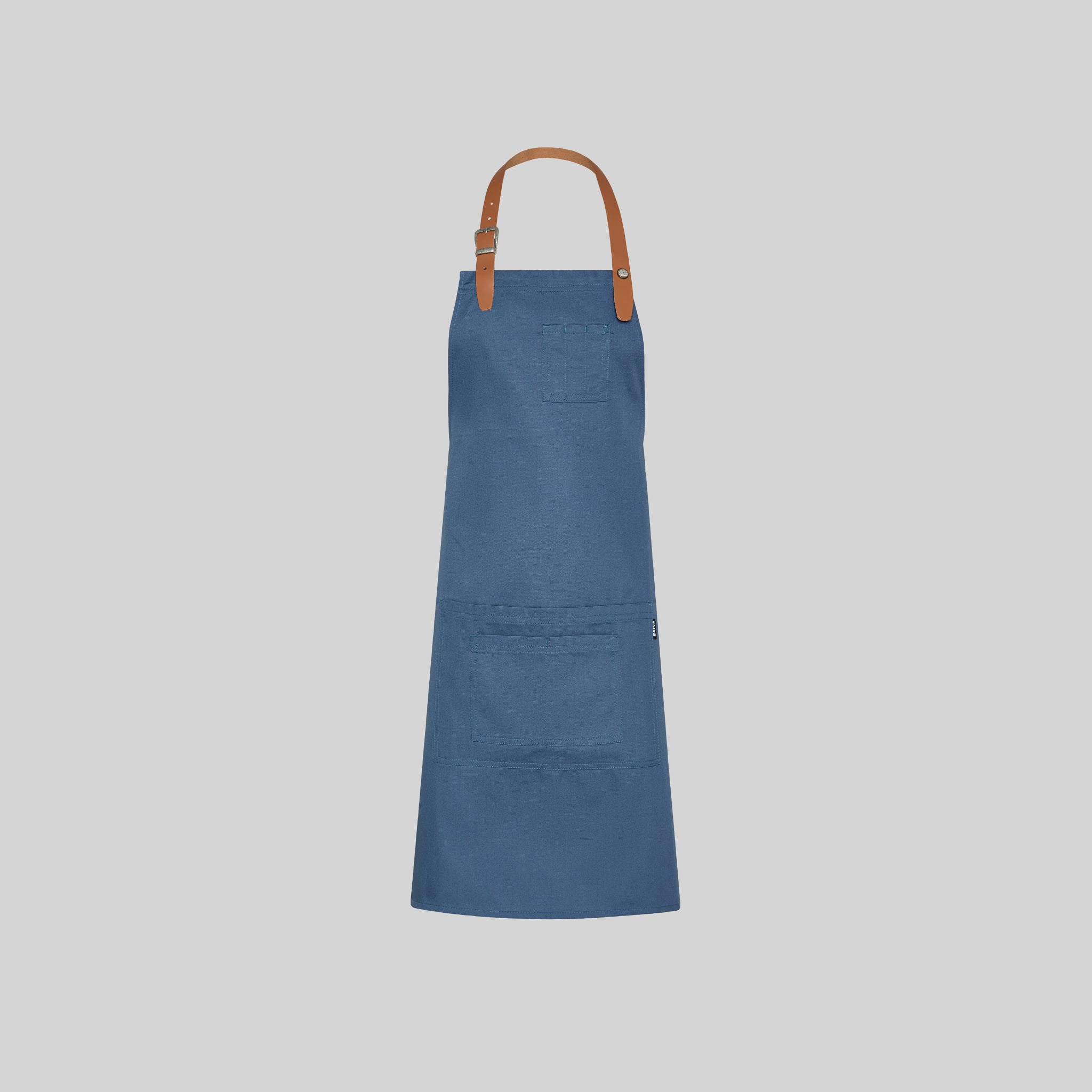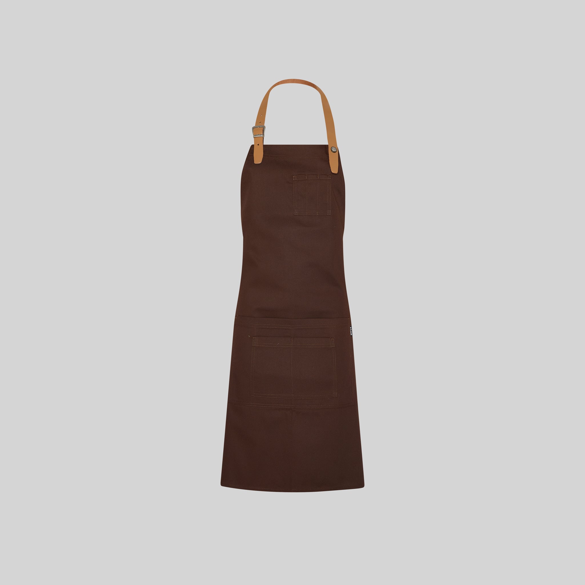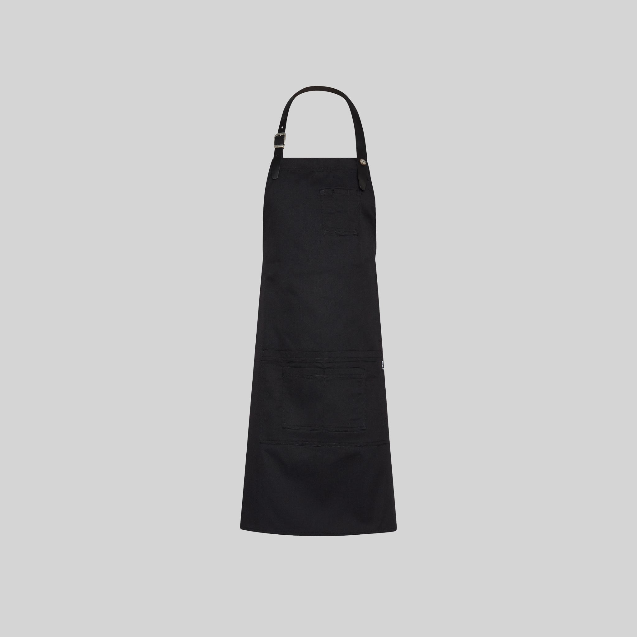 - La tira del peto en cuero, sujeta mediante hebilla y botón de presión, añade un toque de distinción y durabilidad al mandil.