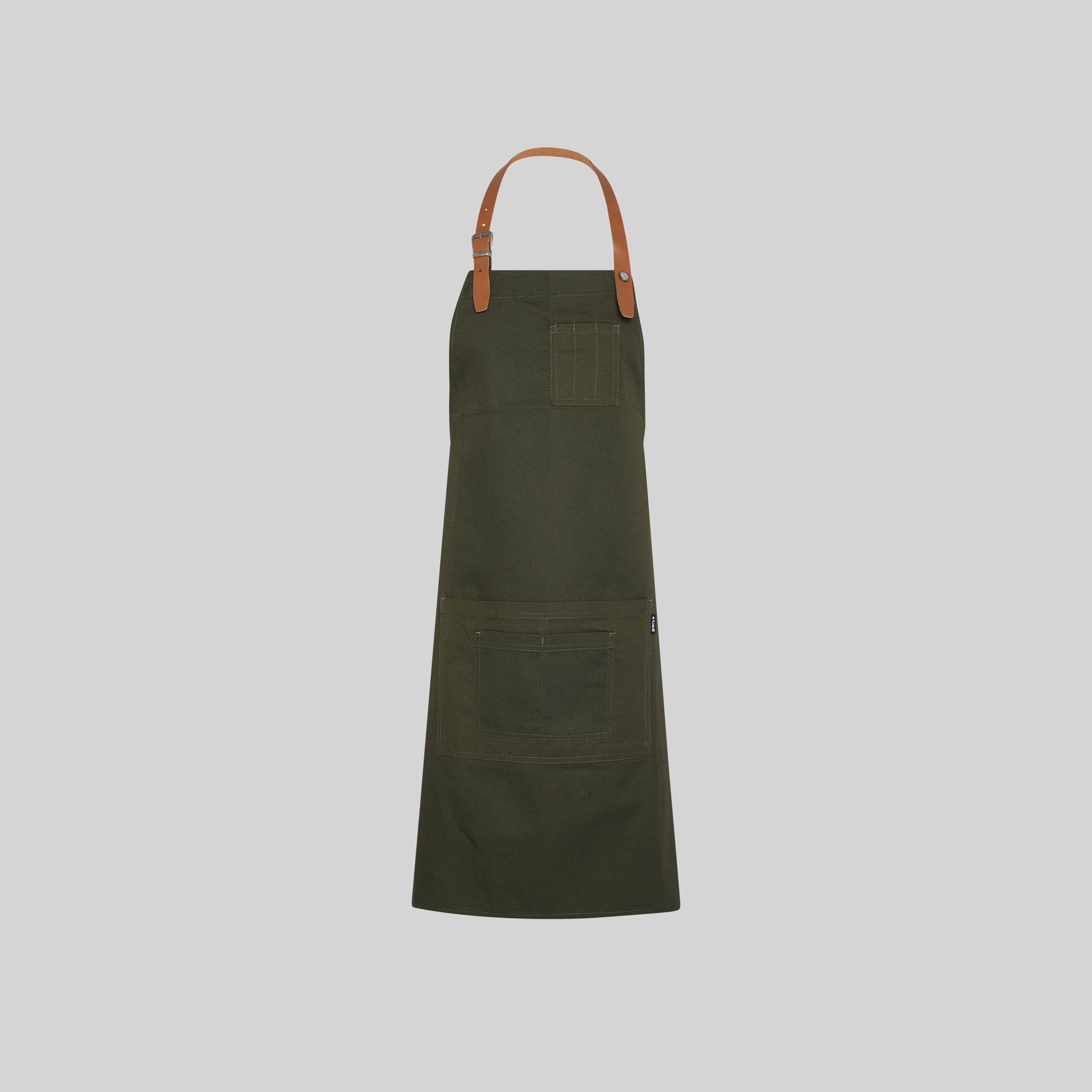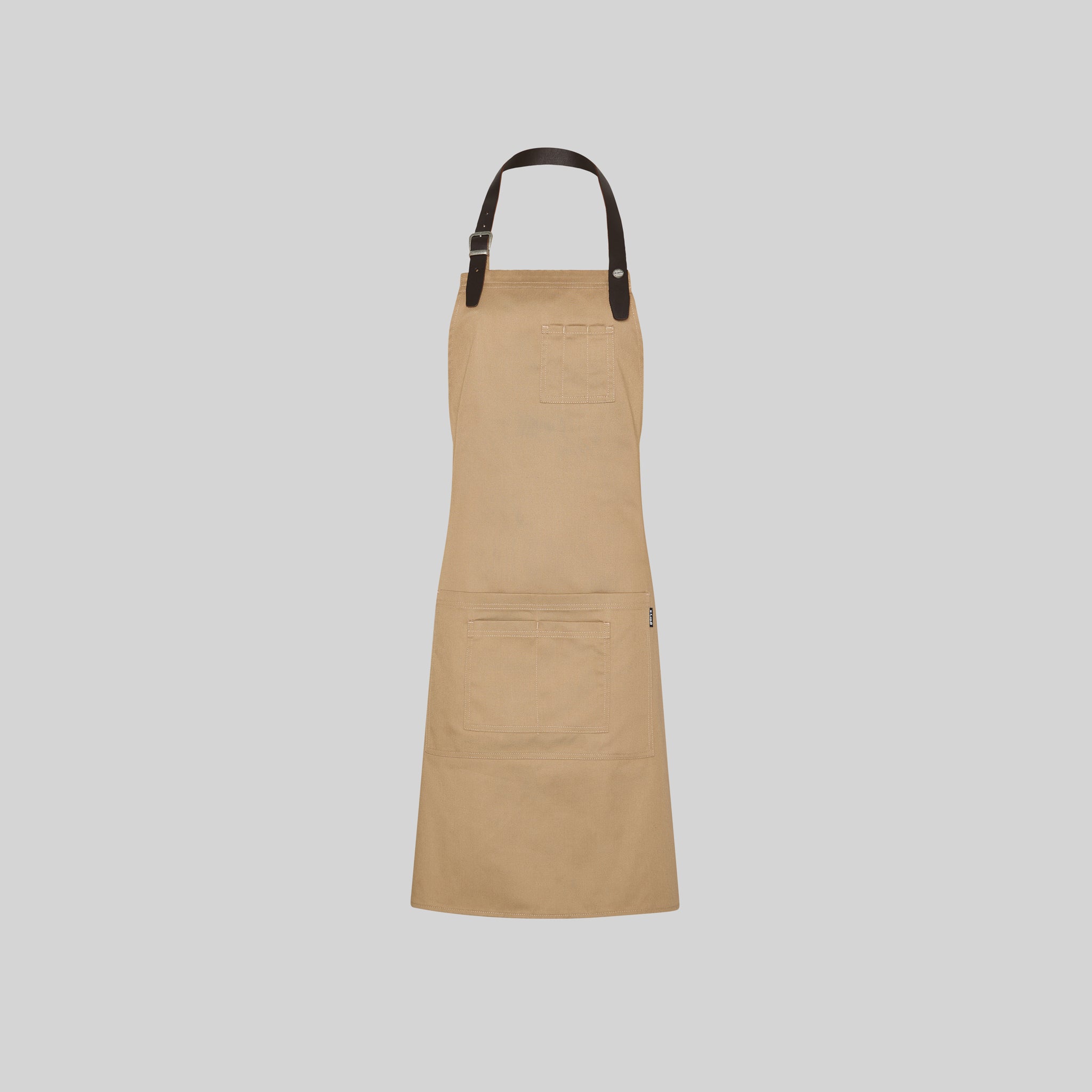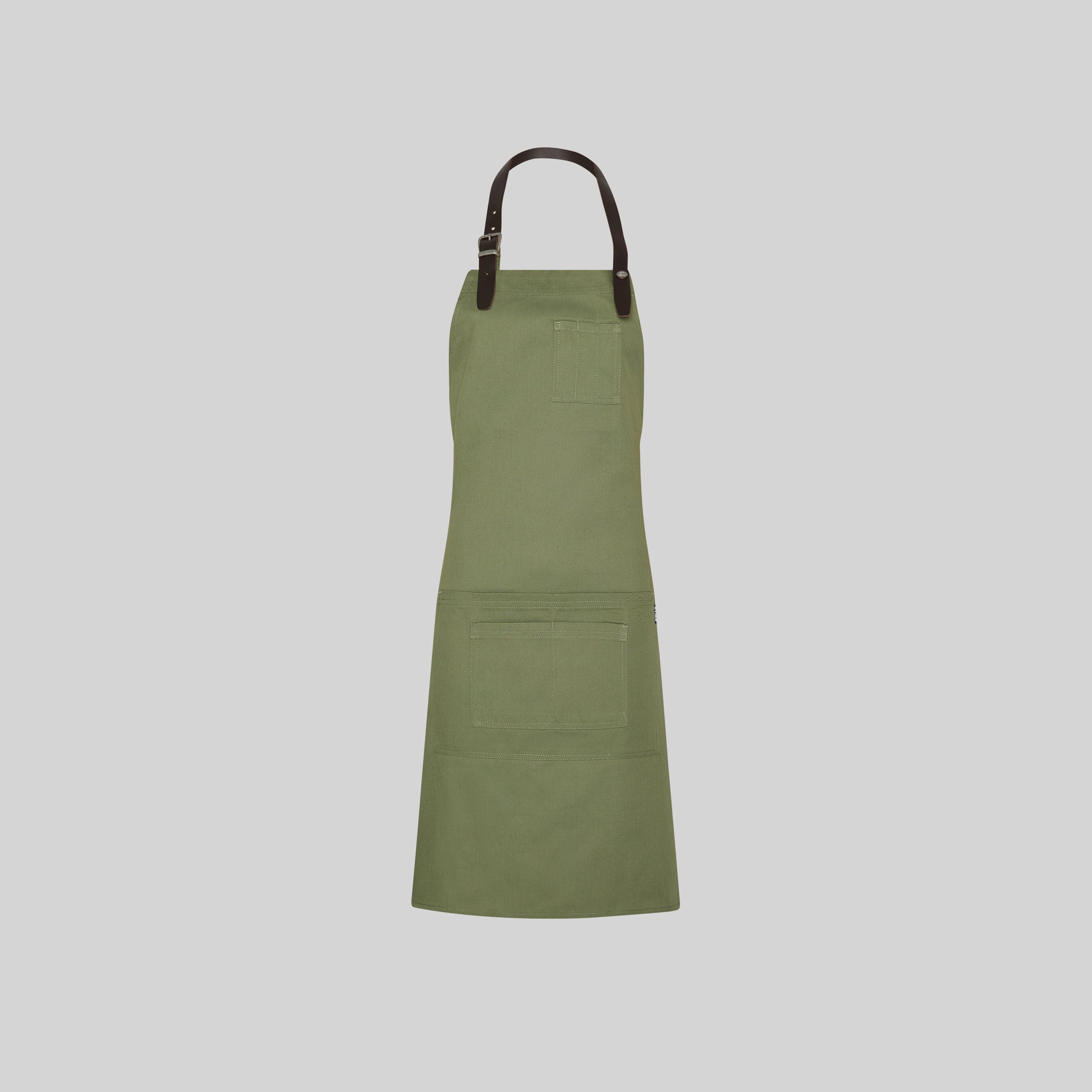 - La tira del peto en cuero, sujeta mediante hebilla y botón de presión, añade un toque de distinción y durabilidad al mandil.